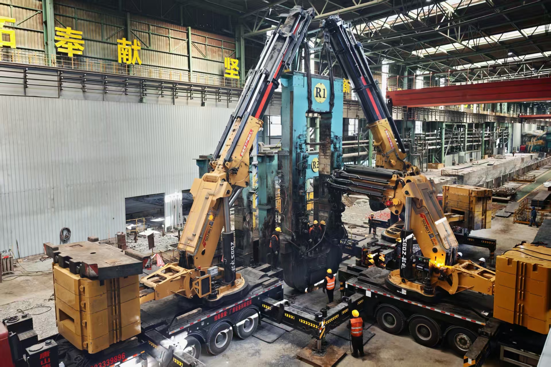 此次吊裝作業(yè)是ESP全豐線升級(jí)改造的核心環(huán)節(jié),需在廠房?jī)?nèi)狹窄空間完成四塊157噸軋機(jī)牌坊的拆除吊裝。面對(duì)廠內(nèi)最大天車(chē)僅100噸、遠(yuǎn)不能滿(mǎn)足吊裝需求的嚴(yán)峻挑戰(zhàn),公司高度重視,多次現(xiàn)場(chǎng)統(tǒng)籌協(xié)調(diào);項(xiàng)目部迎難而上,創(chuàng)新采用三臺(tái)折臂吊協(xié)同吊裝方案,科學(xué)分配載荷、精準(zhǔn)同步控制,成功破解場(chǎng)地受限與載荷不足的難題。施工過(guò)程中,項(xiàng)目管理人員全程堅(jiān)守一線,各崗位協(xié)同配合、規(guī)范操作,確保了四塊牌坊全部一次吊裝安全就位。四塊單重157噸的軋機(jī)牌坊全部安全吊裝完成,標(biāo)志著該生產(chǎn)線升級(jí)改造邁出關(guān)鍵一步。